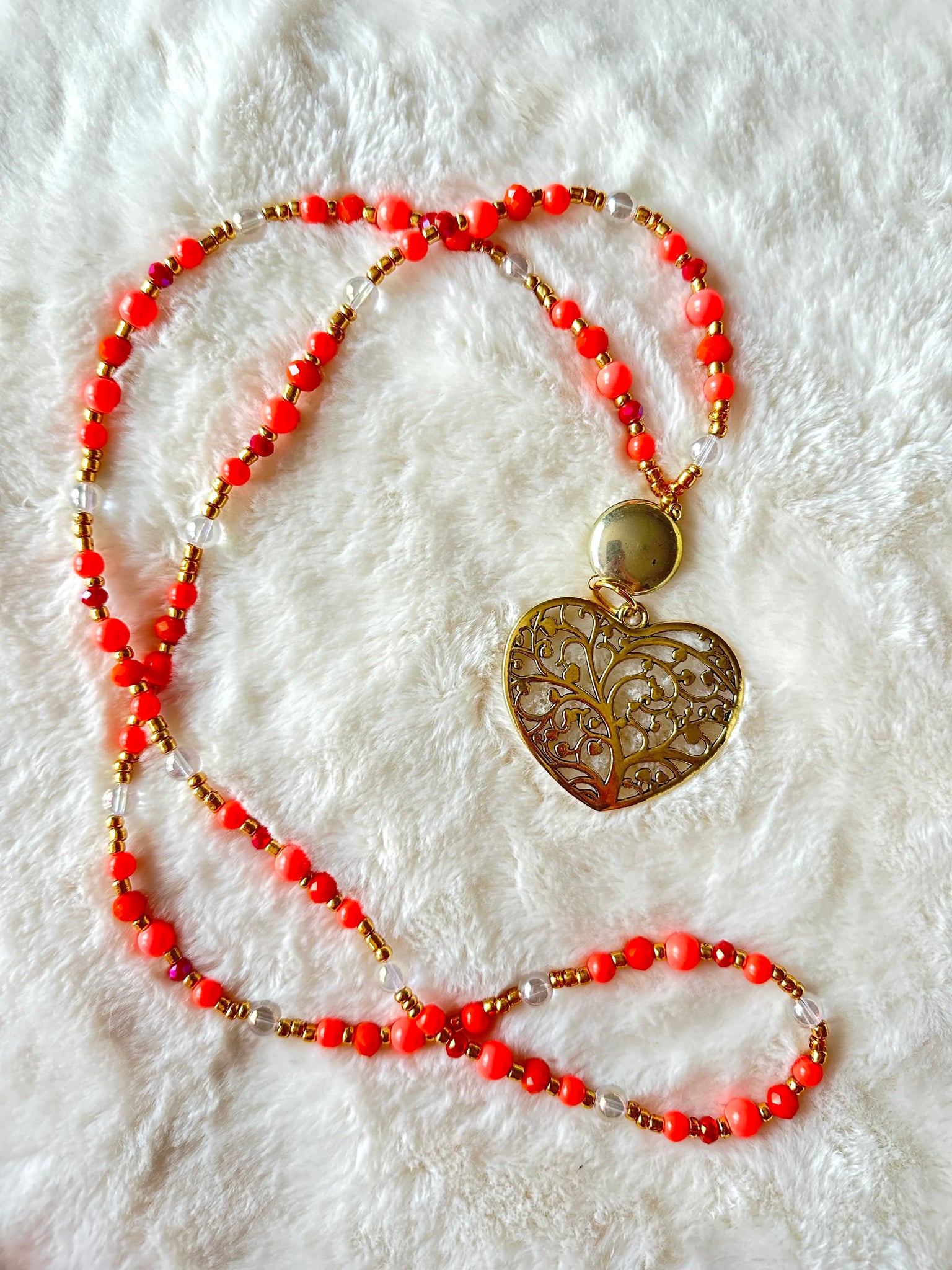 Collar Largo.Color : Sandía/ Naranja/ Dorado.Largo aprox: 52cms.Hecho a mano con piedras y mostacillas.Medallón de Fantasía
