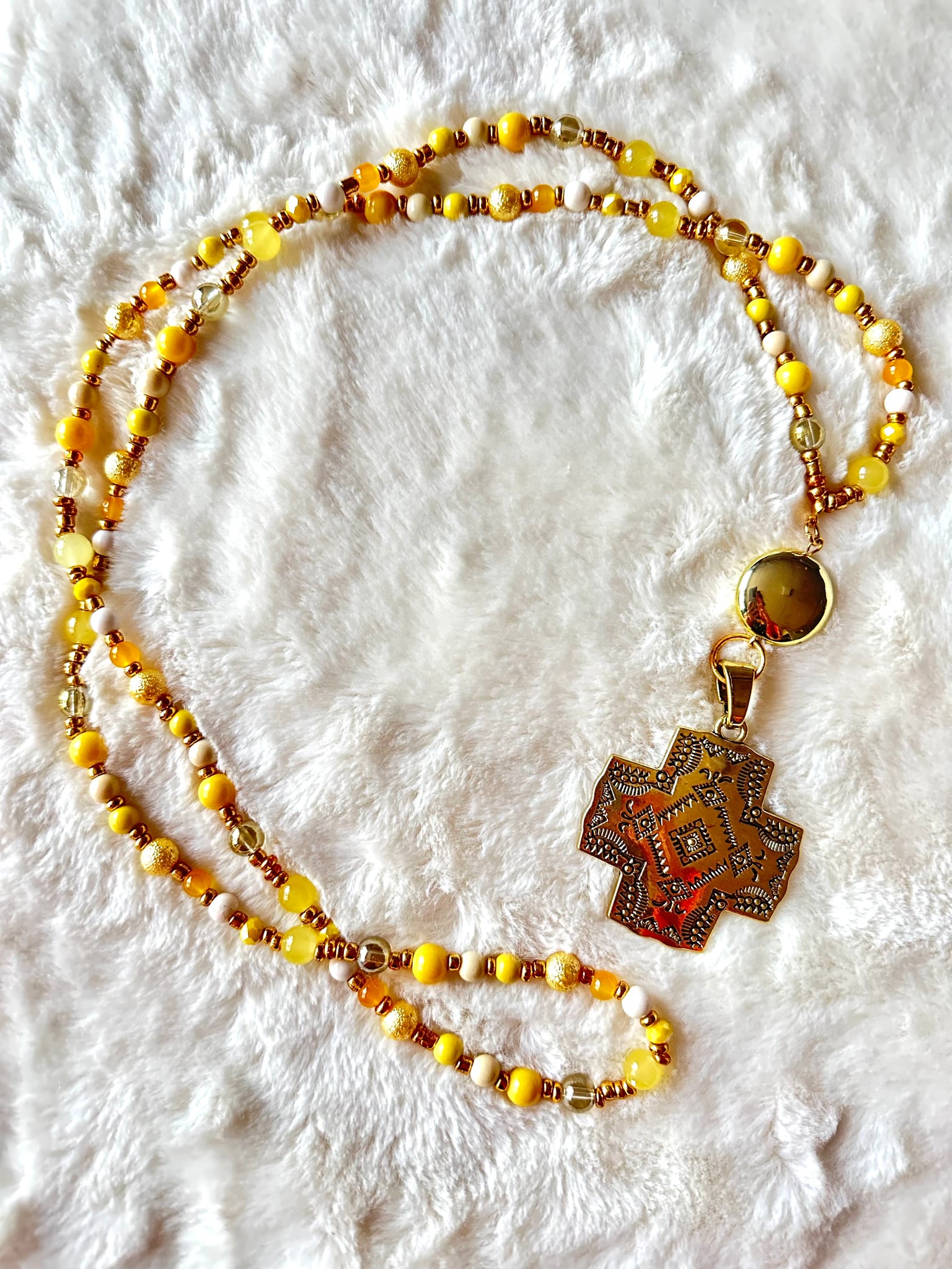 Collar Largo.Color : Amarillo/ Dorado.Largo aprox: 52cms.Hecho a mano con piedras y mostacillas.Medallón de Fantasía